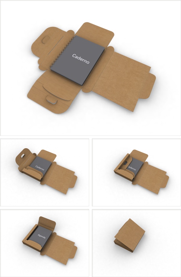 Projeto estrutural (faca especial) para embalagem de caderno e agenda em papelão ondulado visando proteção contra estragos causados pelas espirais (marcas) durante o transporte.
